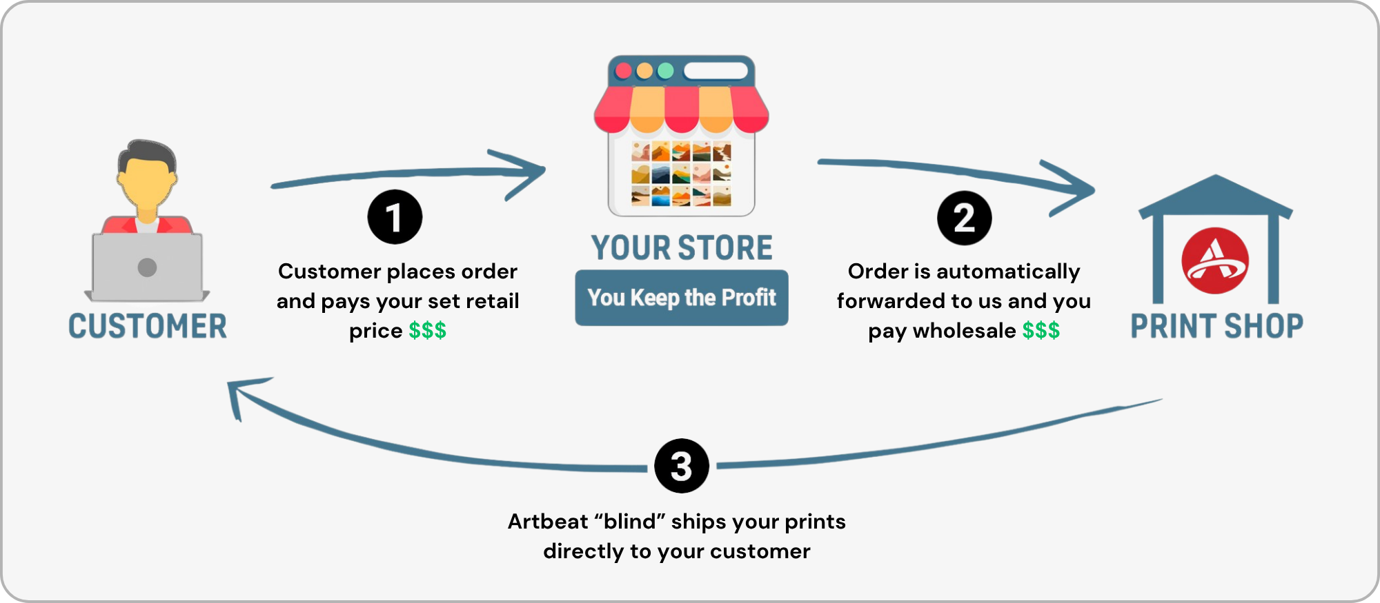 A: Integrating is FREE! You only pay for the prints that we fulfill. No fulfillment fees, no account setup costs, and no monthly service fees. Artbeat understands that there are already an enormous amount of costs associated with running your business. We are extremely grateful you have selected us as your print fulfillment provider and want to minimize costs as much as we can for you and your business.